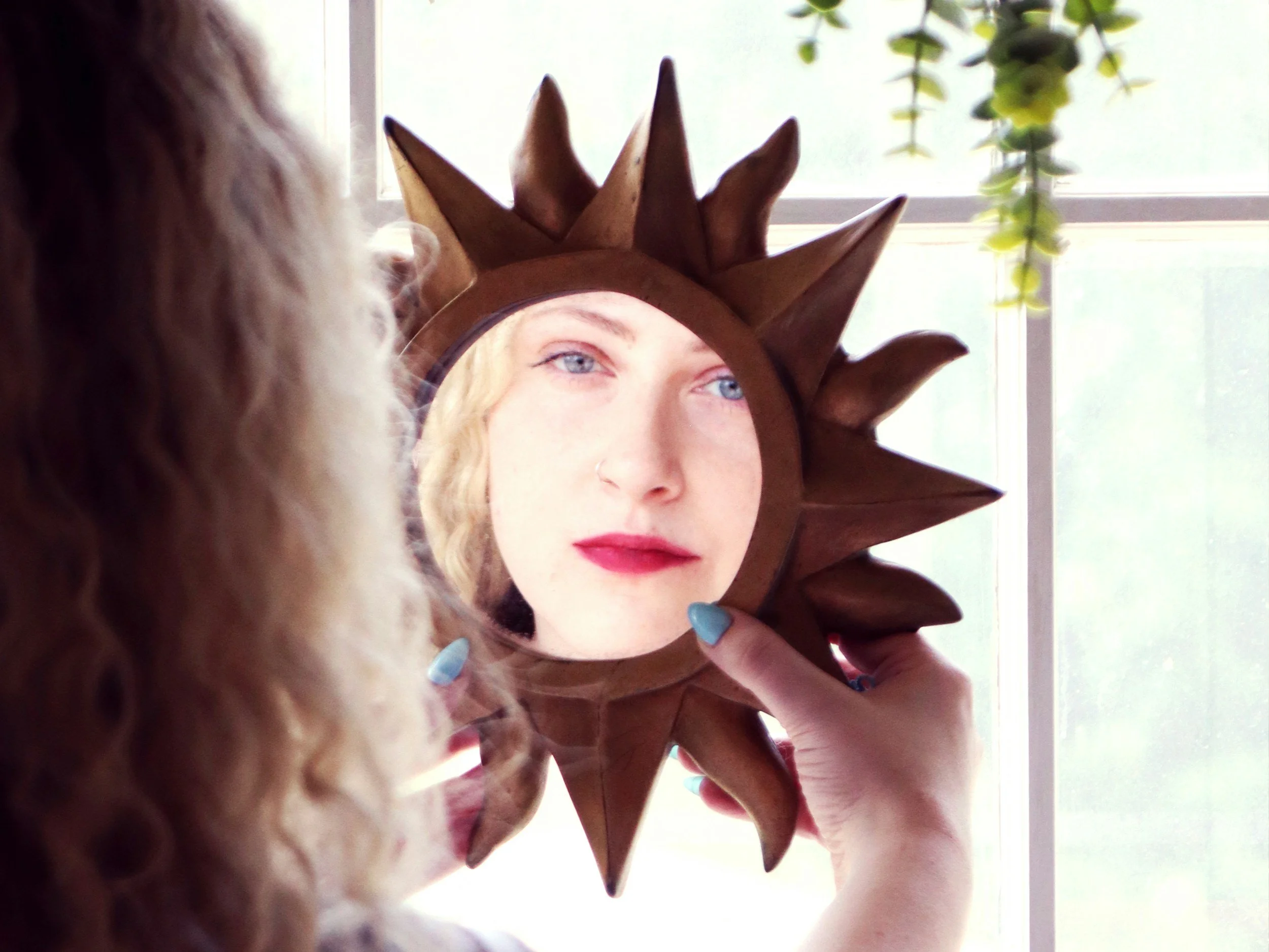A woman pensively looks in a mirror she holds.